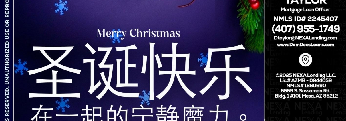 圣诞快乐 在一起的宁静魔力。 - Dom Taylor -Mortgage Loan OfficerHi, my name is Dom Taylor. I’m a Loan Officer with NEXA Lending LLC., offering personalized mortgage solutions, fast customized quotes, great rates and service with integrity.