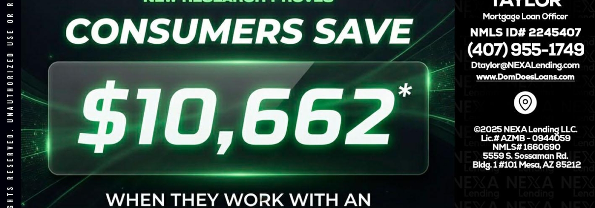 10,662 - Dom Taylor -Mortgage Loan OfficerHi, my name is Dom Taylor. I’m a Loan Officer with NEXA Lending LLC., offering personalized mortgage solutions, fast customized quotes, great rates and service with integrity.