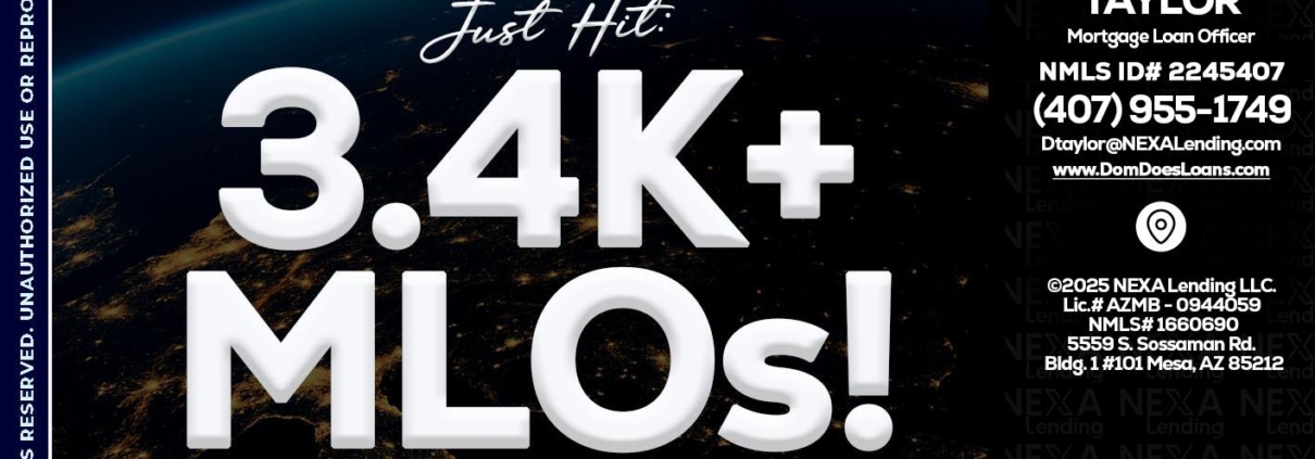3.4K MLOs - Dom Taylor -Mortgage Loan OfficerHi, my name is Dom Taylor. I’m a Loan Officer with NEXA Mortgage LLC., offering personalized mortgage solutions, fast customized quotes, great rates and service with integrity.