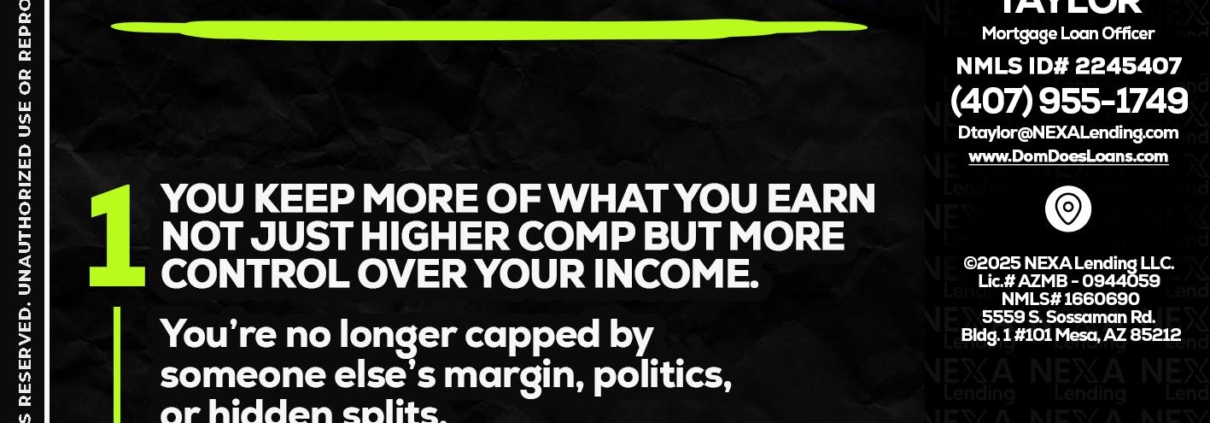 Hi, my name is Dom Taylor. I’m a Loan Officer with NEXA Lending LLC., offering personalized mortgage solutions, fast customized quotes, great rates and service with integrity.