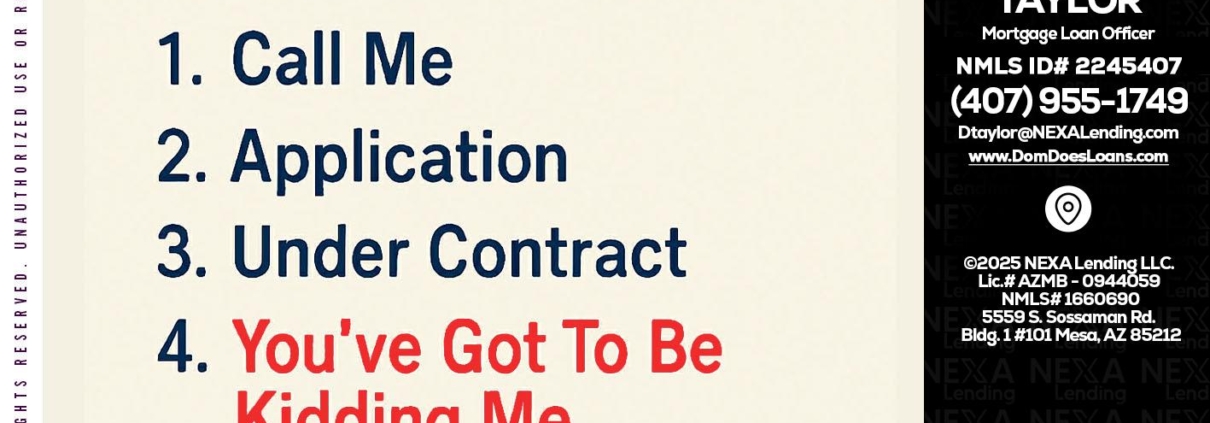 BUYING A HOUSE - Dom Taylor -Mortgage Loan OfficerHi, my name is Dom Taylor. I’m a Loan Officer with NEXA Lending LLC., offering personalized mortgage solutions, fast customized quotes, great rates and service with integrity.