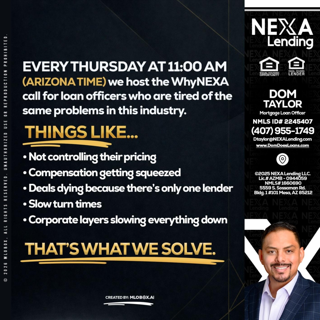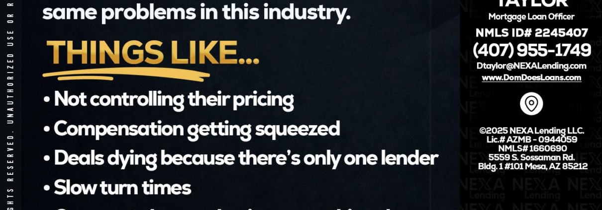 Hi, my name is Dom Taylor. I’m a Loan Officer with NEXA Lending LLC., offering personalized mortgage solutions, fast customized quotes, great rates and service with integrity.