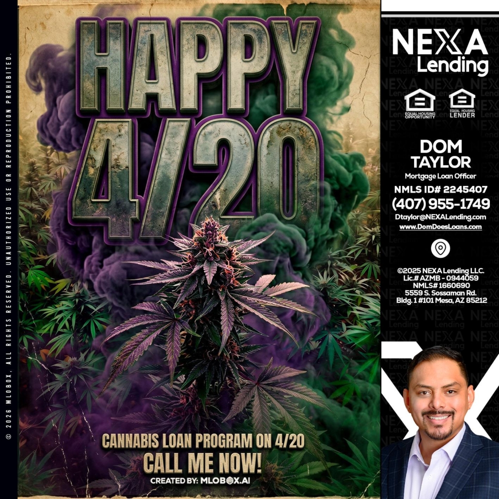HAPPY 420 - Dom Taylor -Mortgage Loan OfficerHi, my name is Dom Taylor. I’m a Loan Officer with NEXA Lending LLC., offering personalized mortgage solutions, fast customized quotes, great rates and service with integrity.