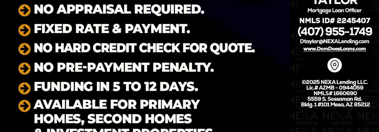 Hi, my name is Dom Taylor. I’m a Loan Officer with NEXA Lending LLC., offering personalized mortgage solutions, fast customized quotes, great rates and service with integrity.