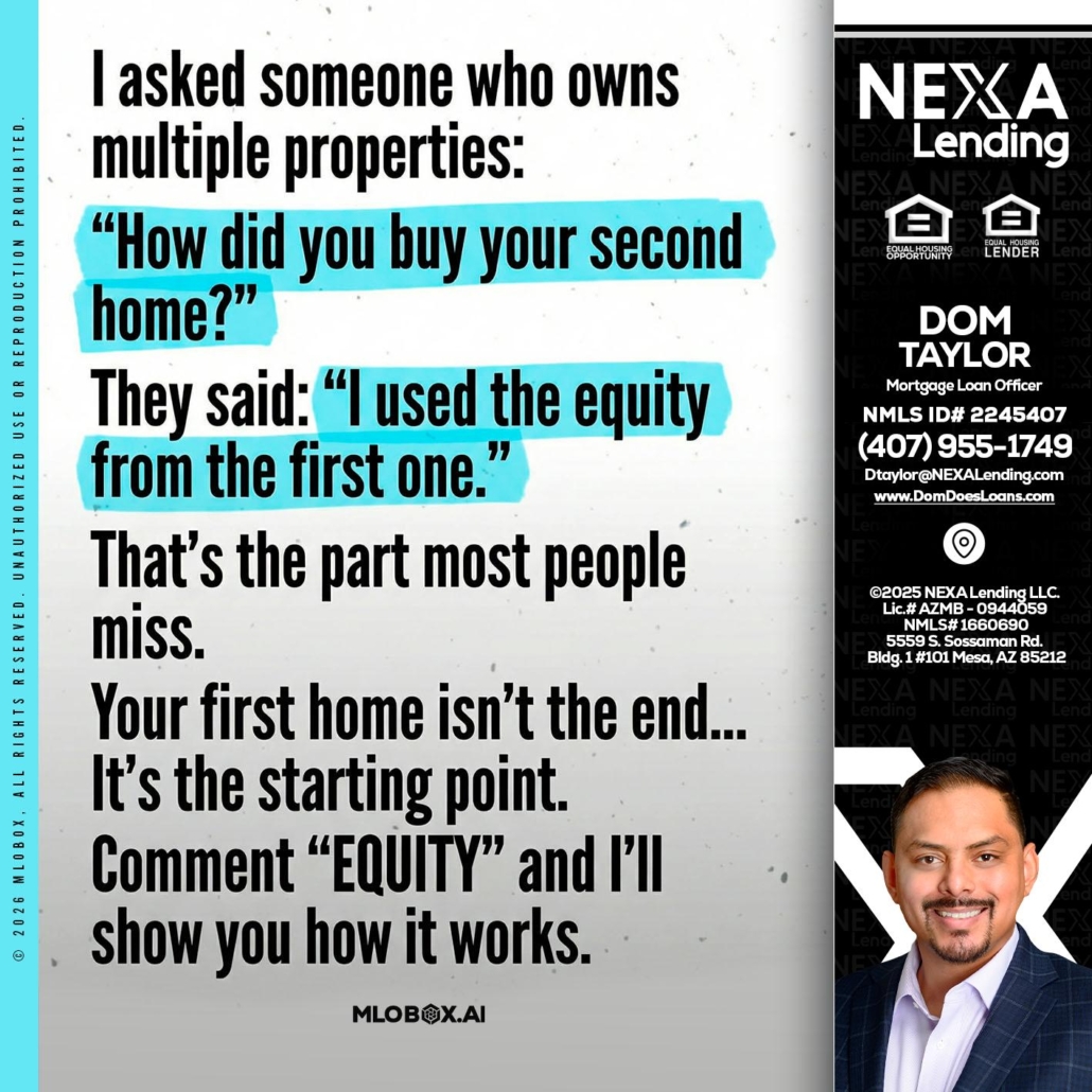 Hi, my name is Dom Taylor. I’m a Loan Officer with NEXA Lending LLC., offering personalized mortgage solutions, fast customized quotes, great rates and service with integrity.