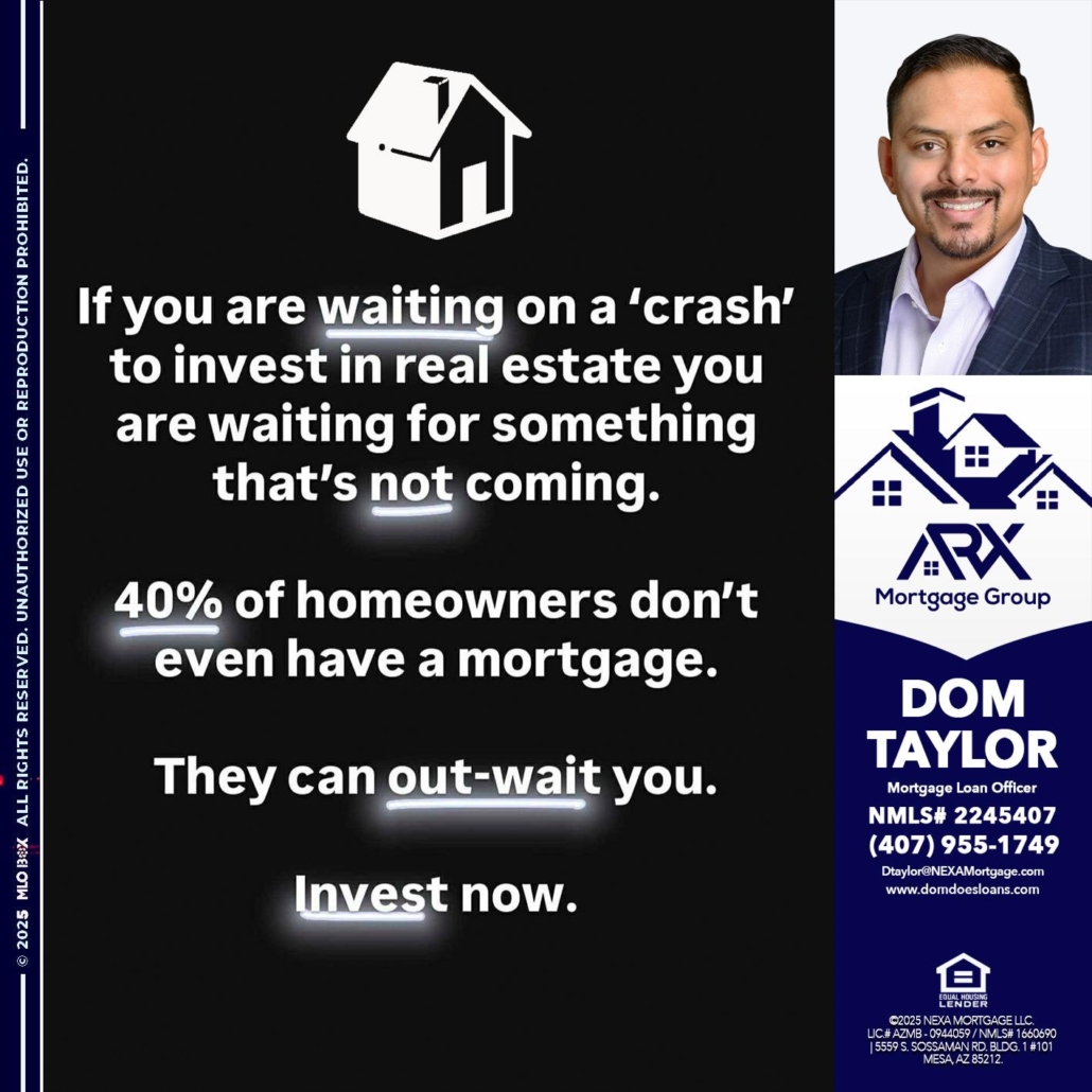 IF YOU ARE WAITING - Dom Taylor -Mortgage Loan OfficerHi, my name is Dom Taylor. I’m a Loan Officer with NEXA Mortgage LLC., offering personalized mortgage solutions, fast customized quotes, great rates and service with integrity.