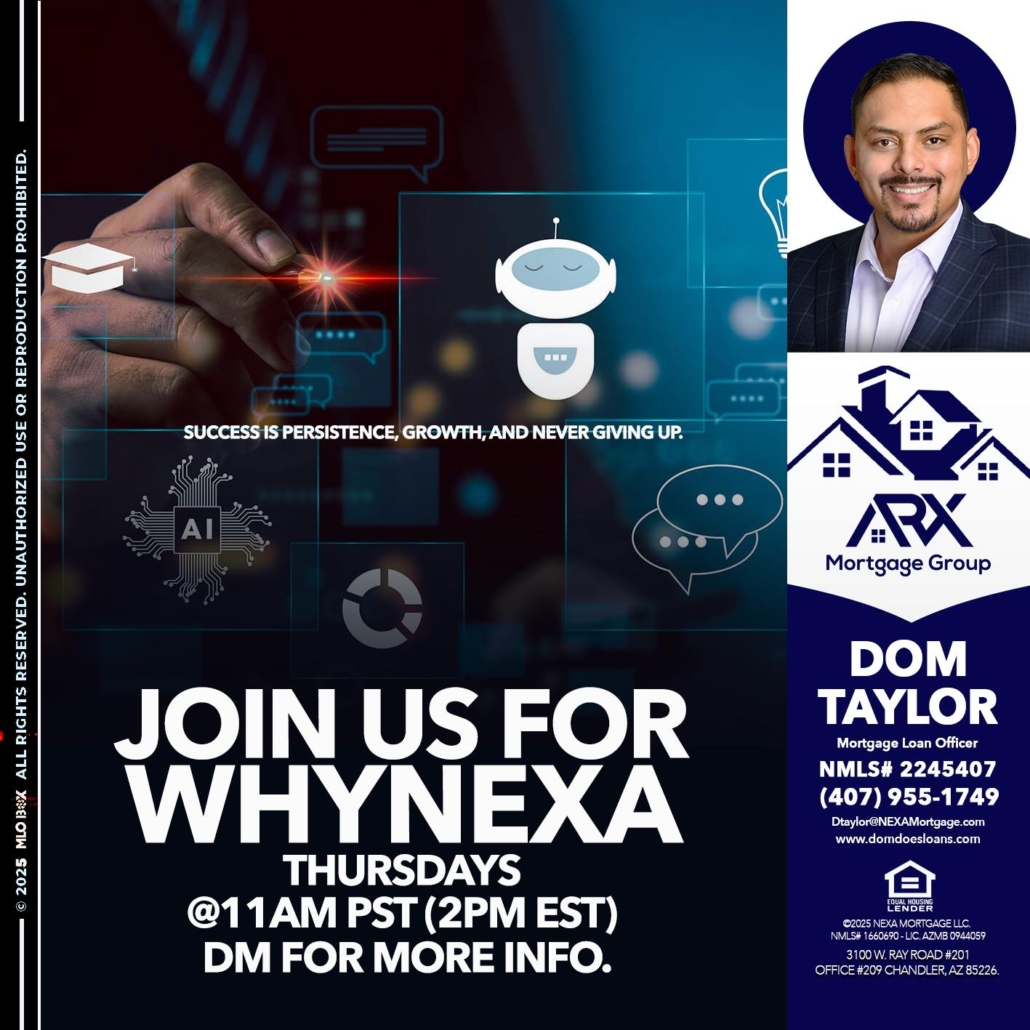 JOIN US FOR WHY NEXA - Dom Taylor -Mortgage Loan OfficerHi, my name is Dom Taylor. I’m a Loan Officer with NEXA Mortgage LLC., offering personalized mortgage solutions, fast customized quotes, great rates and service with integrity.