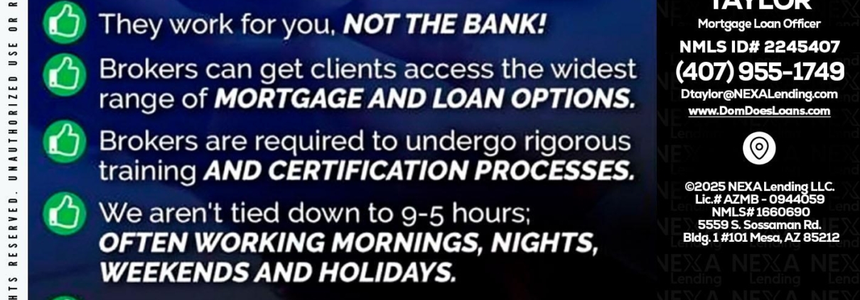Hi, my name is Dom Taylor. I’m a Loan Officer with NEXA Lending LLC., offering personalized mortgage solutions, fast customized quotes, great rates and service with integrity.