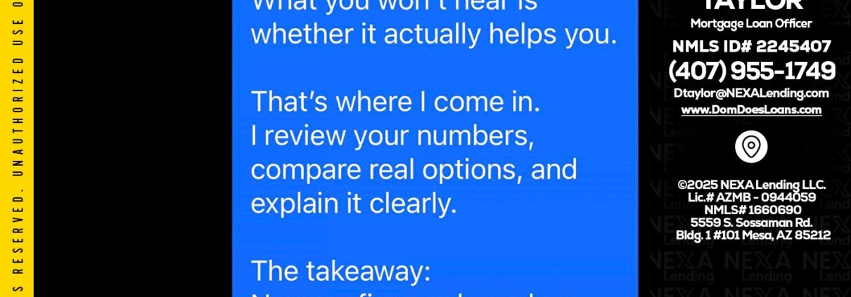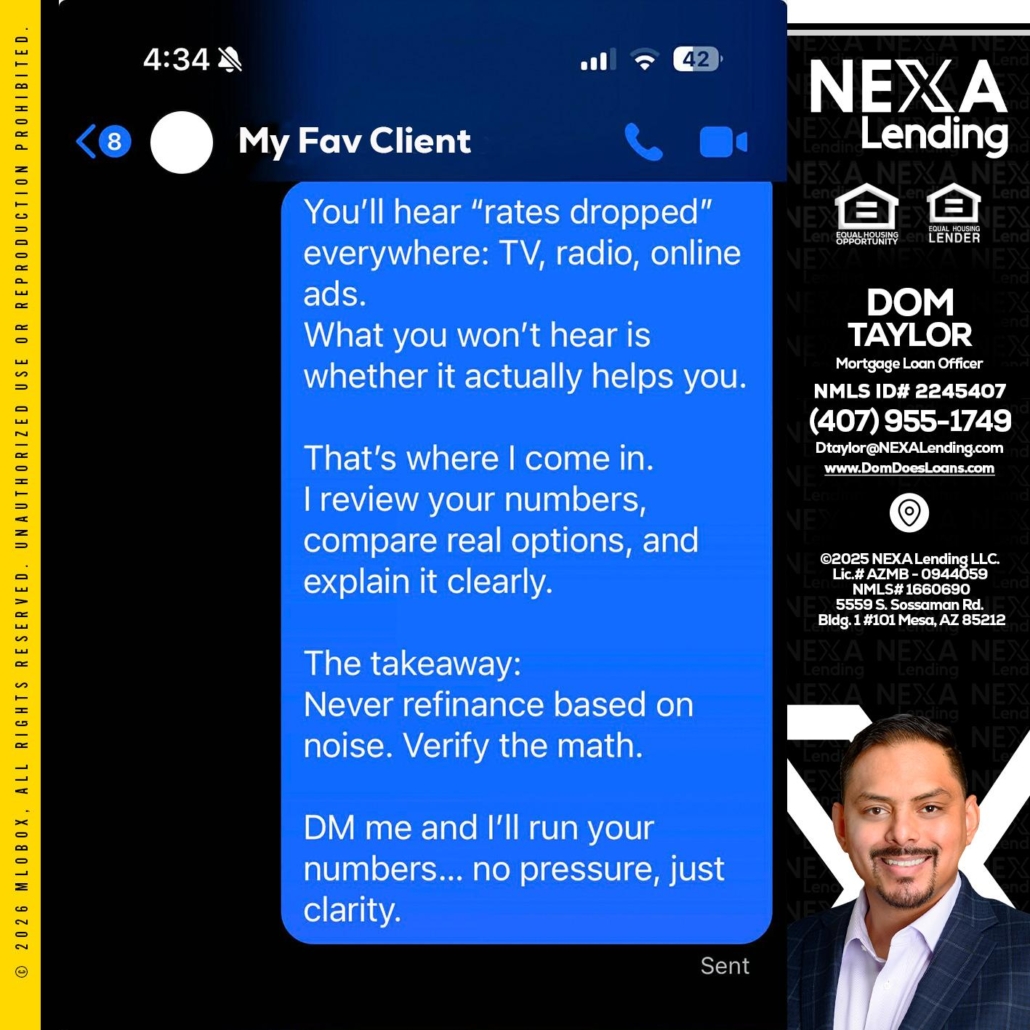 MY FAV CLIENT - Dom Taylor -Mortgage Loan OfficerHi, my name is Dom Taylor. I’m a Loan Officer with NEXA Lending LLC., offering personalized mortgage solutions, fast customized quotes, great rates and service with integrity.