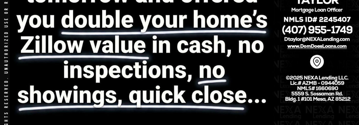 QUICK QUESTION - Dom Taylor -Mortgage Loan OfficerHi, my name is Dom Taylor. I’m a Loan Officer with NEXA Lending LLC., offering personalized mortgage solutions, fast customized quotes, great rates and service with integrity.
