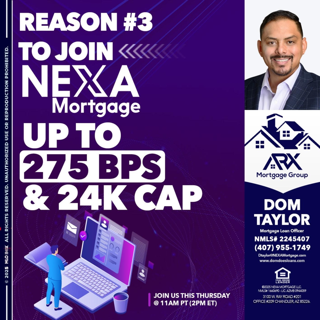 REASON 3 - Dom Taylor -Mortgage Loan OfficerHi, my name is Dom Taylor. I’m a Loan Officer with NEXA Mortgage LLC., offering personalized mortgage solutions, fast customized quotes, great rates and service with integrity.