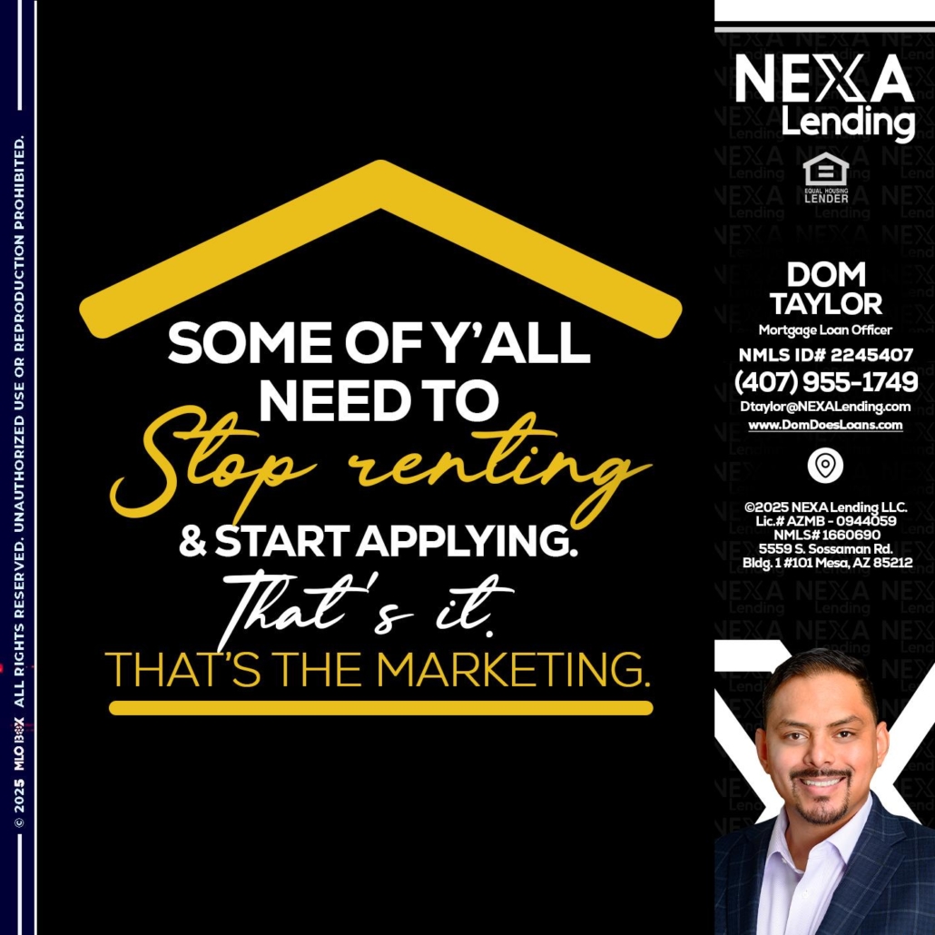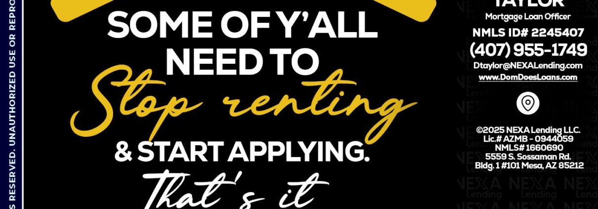 Hi, my name is Dom Taylor. I’m a Loan Officer with NEXA Mortgage LLC., offering personalized mortgage solutions, fast customized quotes, great rates and service with integrity.