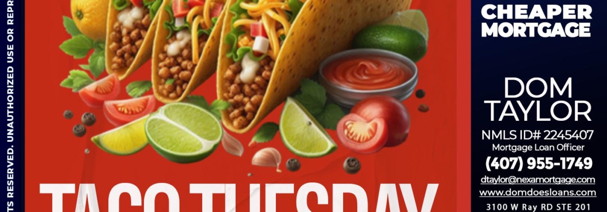 TACO TUESDAY - Dom Taylor -Mortgage Loan OfficerHi, my name is Dom Taylor. I’m a Loan Officer with NEXA Mortgage LLC., offering personalized mortgage solutions, fast customized quotes, great rates and service with integrity.