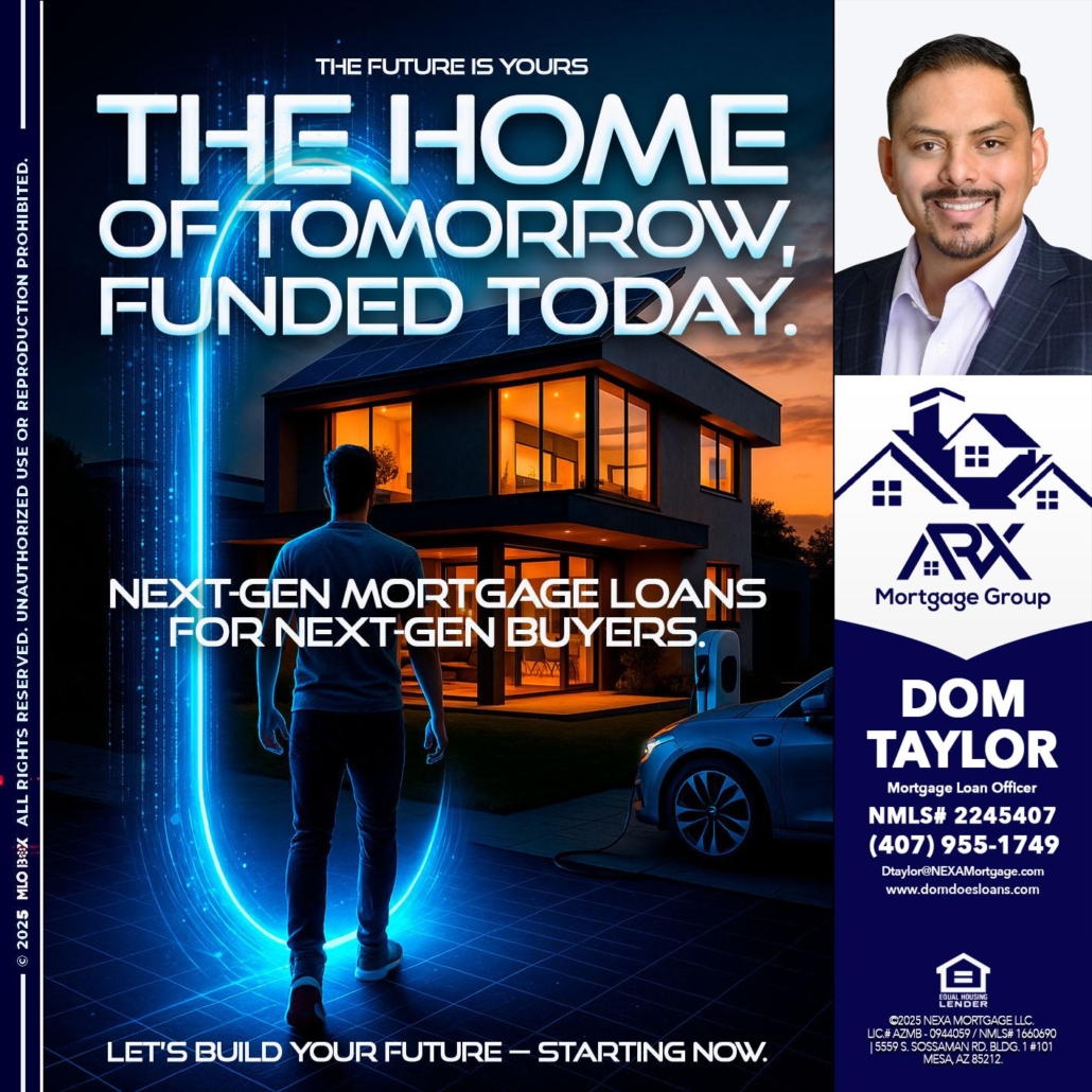 THE HOME - Dom Taylor -Mortgage Loan OfficerHi, my name is Dom Taylor. I’m a Loan Officer with NEXA Mortgage LLC., offering personalized mortgage solutions, fast customized quotes, great rates and service with integrity.