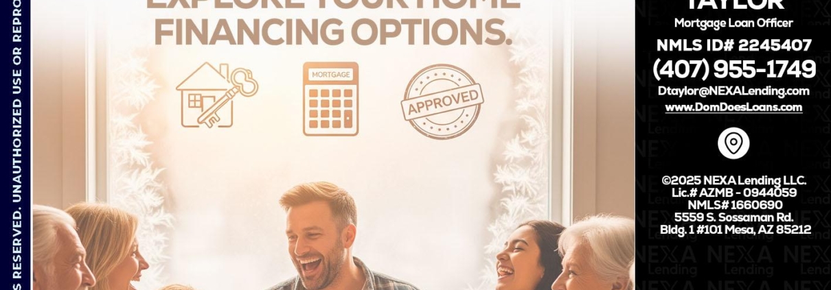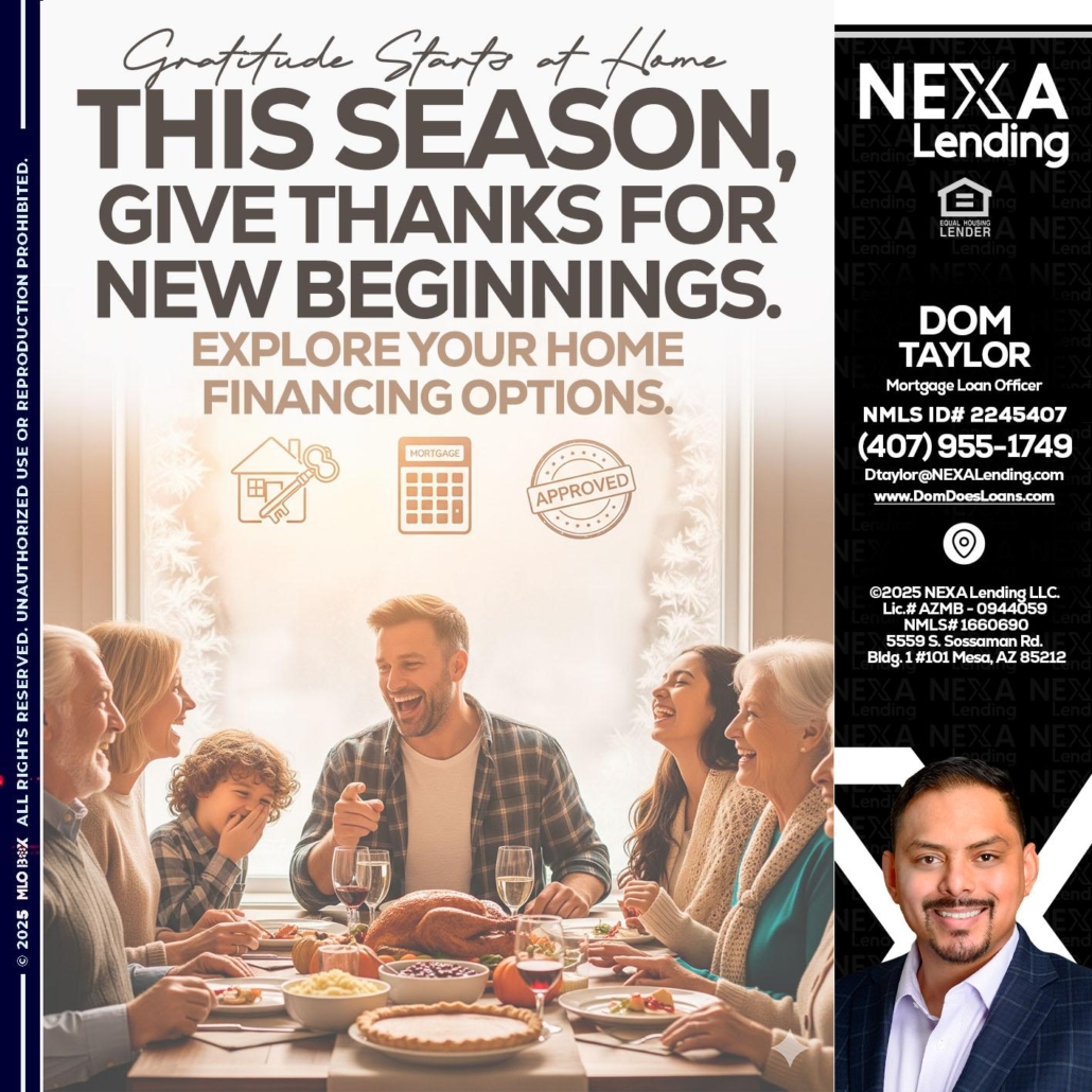 THIS SEASON - Dom Taylor -Mortgage Loan OfficerHi, my name is Dom Taylor. I’m a Loan Officer with NEXA Mortgage LLC., offering personalized mortgage solutions, fast customized quotes, great rates and service with integrity.
