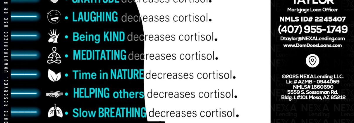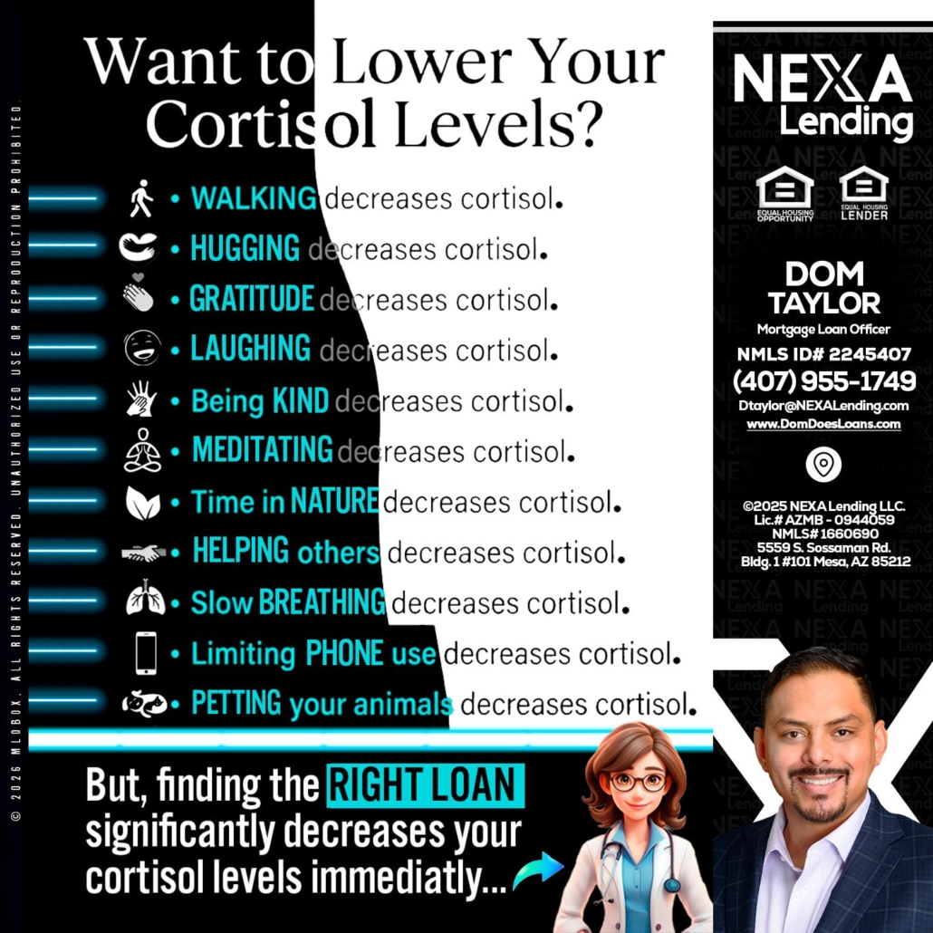 Want to lower Your Cortisol Levels? - Dom Taylor -Mortgage Loan OfficerHappy Wednesday People. I’m a Loan Officer offering personalized mortgage solutions, fast customized quotes, great rates and service with integrity.