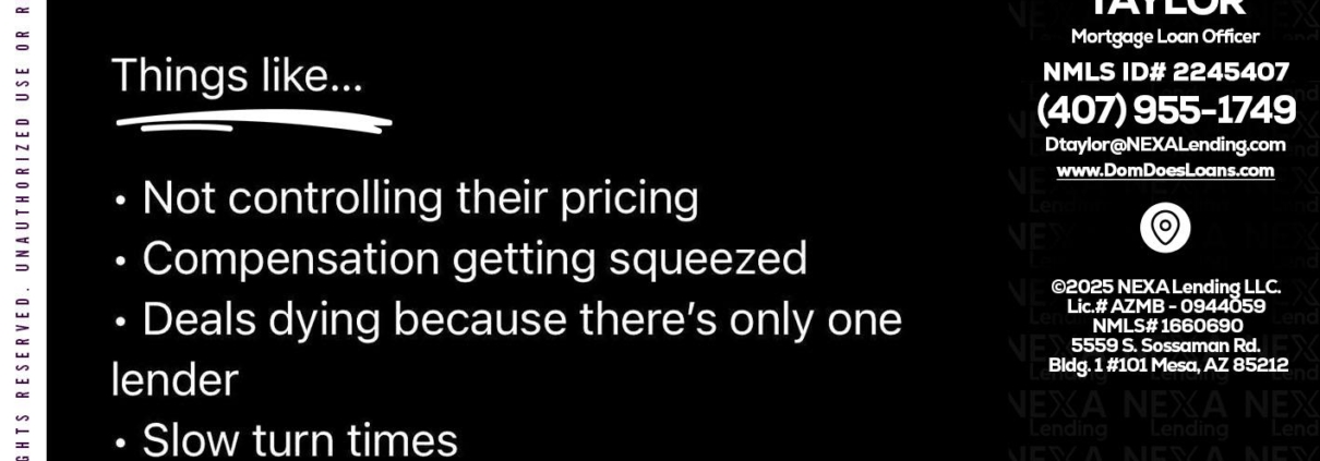 Hi, my name is Dom Taylor. I’m a Loan Officer with NEXA Lending LLC., offering personalized mortgage solutions, fast customized quotes, great rates and service with integrity.
