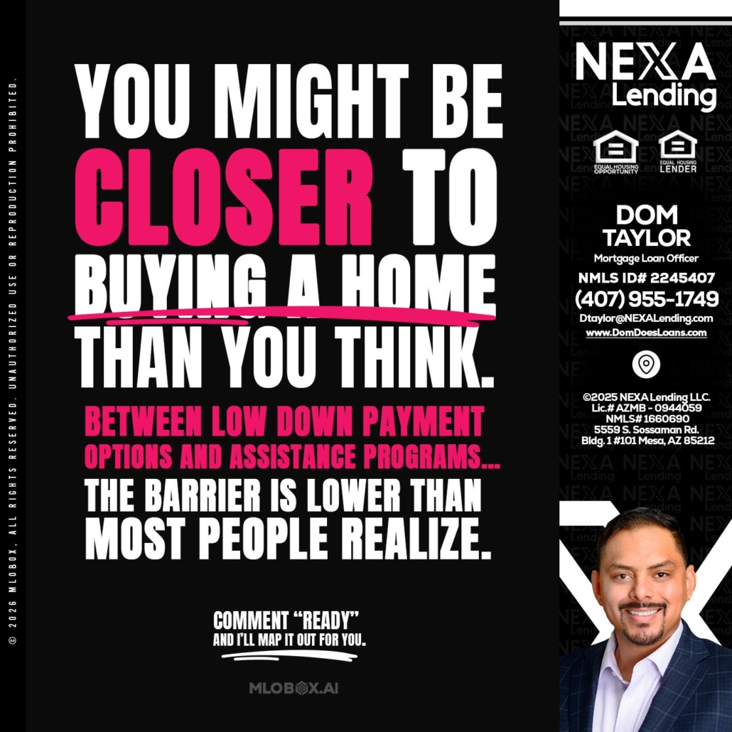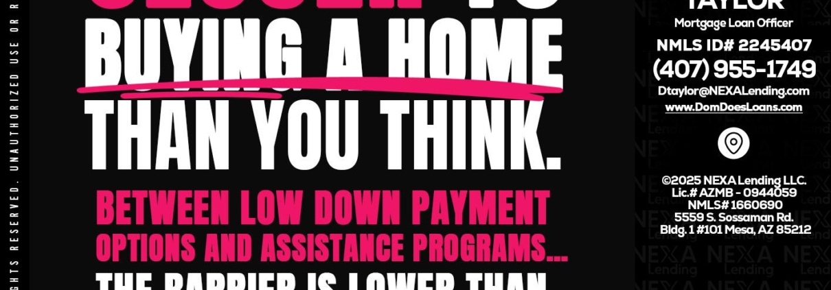 Hi, my name is Dom Taylor. I’m a Loan Officer with NEXA Lending LLC., offering personalized mortgage solutions, fast customized quotes, great rates and service with integrity.